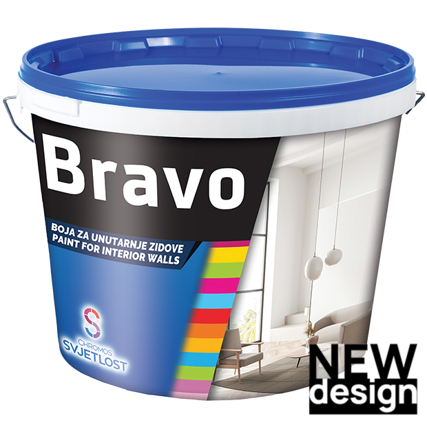 Bravo je disperzijska barva za notranje zidove, odporna je na suho krtačenje ter ima visoko belino in dobro pokrivnost.