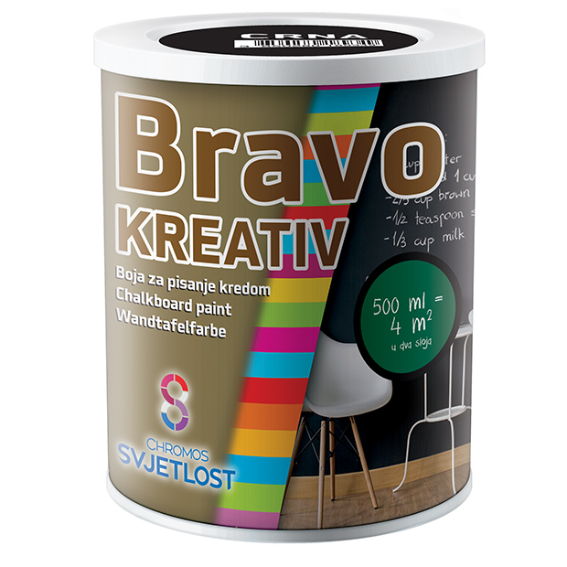 BRAVO KREATIV – visokokvalitetna barva, ki tvori elastičen film in omogoča pisanje s kredo po zidnih in lesnih površinah. Obarvane površine so posebno odporne na obrabo in se lahko perejo z navadno vodo.