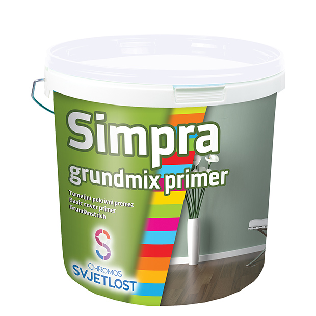 SIMPRA GRUNDMIX PRIMER - základní nátěr k impregnaci vnitřních stěn. Používá se pro zlepšení krytí finálních vrstev malířských barev na špinavé stěny nebo nehomogenní povrchy, jako jsou nové zdi. Také zlepšuje krytí problematických odstínů finálního nátěru. Doporučuje se také pro vnitřní povrchy s tmavými odstíny, které je třeba přetřít na jiný nový odstín.